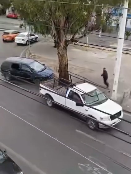 (15:28)… Los sujetos de la camioneta blanca, estacionaron su camioneta en las vías y calle 6 para continuar con su agresión, por lo que varios ciudadanos y comerciantes de la zona intentaron ayudar al tripulante; «Vamos a hacerle paro al don, esos weyes son tres y el solo es uno, vamos», expresaron los vecinos. Al ver la cantidad, de personas intentaron huir del lugar, pero en ese momento hizo aparición una patrulla de la @GuardiaCivilEstatal la cual les cerró el paso, por lo que pensamos que el hecho había terminado.