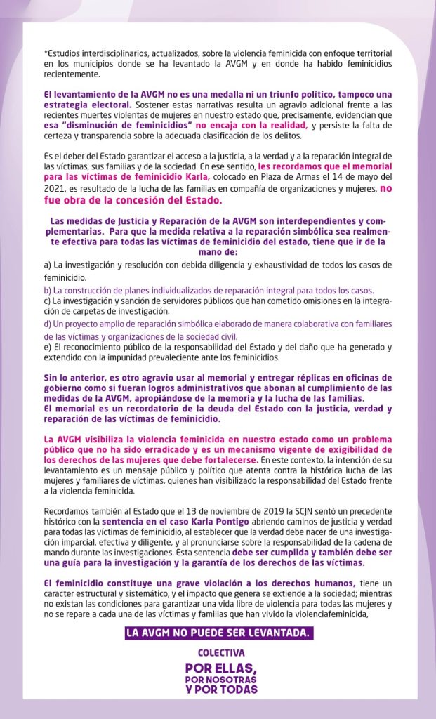 Las integrantes piden que, antes de pensar en retirar la AVGM, el Estado: