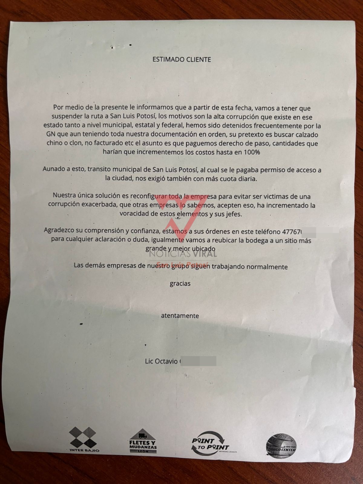 En un comunicado dirigido a sus clientes, las fleteras aseguran que han sido detenidas constantemente por la Guardia Nacional, a pesar de tener toda su documentación en regla. “El pretexto es buscar calzado chino, mercancía clonada o sin factura… pero lo que realmente quieren es que paguemos derecho de paso”, se lee en el mensaje firmado por un supuesto Lic. Octavio.
